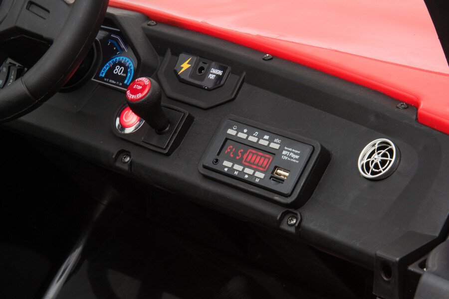 Wahlweise kann das Kind kann selbst mit Lenkrad bzw. Gaspedal und die Erwachsenen können mit der 2,4Ghz 4 Wege – Fernsteuerung das Fahrzeug bedienen. Es ist ein MP3 Anschluss eingebaut und Sound kann reguliert werden. Dank 4 x 12V und 75W Elektro Motoren hat er genug Kraft um die Kinder mit bis zu 60 kg tragen zu können. Es sind Scheinwerfer eingebaut.