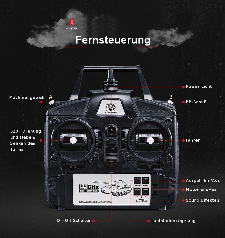 Fernbedienung: Vorwärts / rückwärts normal und HIGH SPEED, vorwärts Links- oder Rechtsdrehung, rückwärts Links- oder Rechtsdrehung , Kanone heben und senken, Geschützturm um 320° drehbar (160° rechts / 160° links), Munitionsabschuss auch während der Fahrt